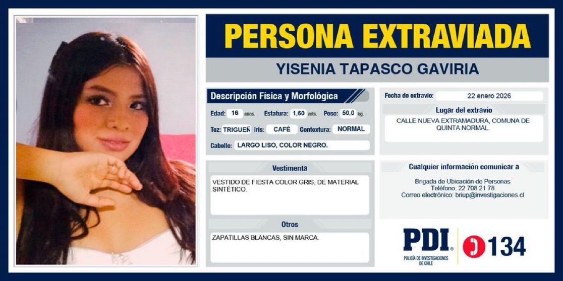 Una profunda preocupación existe en la comuna de Quinta Normal tras la desaparición de Yesenia Tabasco Gaviria, adolescente de 16 años, cuyo paradero se desconoce desde el pasado 22 de enero en la Región Metropolitana.
