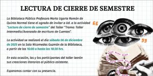 La Biblioteca Pública Profesora Marta Ugarte Román invita a la comunidad de Quinta Normal a participar en la muestra anual del Taller de Cuento, instancia … Continúa leyendo Taller de Cuento de la Biblioteca Marta Ugarte realizará muestra anual este sábado en Quinta Normal